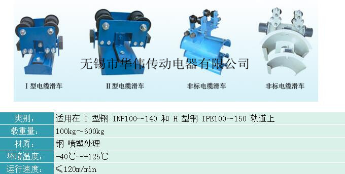 ?GHC型工字鋼電纜滑車系列為起重機小車供電的一種導電形式。它有走輪、支架、托板組成,將軟電纜固定在托板上,由牽引架與電纜滑車同步,從而實現(xiàn)小車供電的目的。GHC型工字鋼電纜滑車系列分為中載荷型、重載荷型和輕載荷型,因此滑車行走輪為¢86、¢73、¢55的三種。承載能力<50~150kg,每類按托板層數(shù)分為單層、雙層、三層,每類中有三種形式。GHC型系列工字鋼滑車裝置用于移動供電機械在移動中電纜的懸吊與移動,已廣泛應用于各類起重機械中。該裝置具有結構堅固,移動靈活,安全可靠等優(yōu)點。